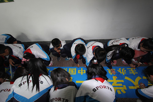 参观结束后,志愿者们与孩子通过素拓项目进行了互动,不仅加深了彼此之间的交流,也为接下来的座谈活动营造了轻松的氛围。 为了进行更加深度的交流,下午志愿者组织孩子们在机电馆教室进行座谈,孩子们积极踊跃地对着录像机表达出对父母及老师的感激爱意,不少孩子们利用这个难得的机会大声说出了自己的梦想与决心。狮子会成员为每位师生送上了精美的礼物。座谈会的最后,大四平中心小学的校长发表了简单的讲话,表达了对志愿者的感谢,对同学们的祝福。狮子会成员也向校长送上了同学们亲手绘制、包含着满满心愿的横幅。