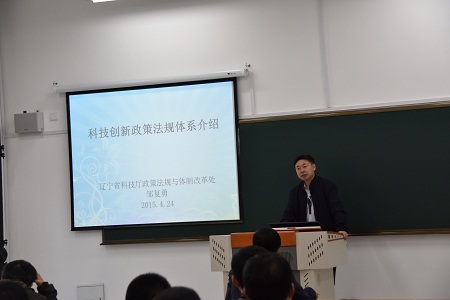 邹处长以科技政策的特点、作用和法规体系为切入点开始此次讲座,他从科技投入政策以及促进自主创新的税收政策、政府采购政策、金融政策、知识产权政策等7个方面介绍了我国科技创新政策法律法规体系。为使在座的师生能够更加直观的了解科技政策,邹处长还为大家带来了一份“大礼”——《辽宁省自主创新促进条例》手册,并以手册为例,为大家详细介绍了其产生背景、基本思路、主要内容和形成过程。