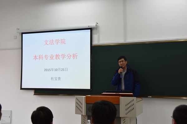刘武为与会教师作了“文法学院课程质量评价分析报告”。他回顾了近五年教学督导组的教学评价情况,并寄语学院教师,希望他们能够多关注学生的学习情况,重视学生的学业教育。杜宝贵做了“文法学院本科专业评价分析报告”,他梳理了2011-2015年的全院教师教学评价结果,并针对相关评价指标进行了比对分析,并希望全院教师能够立足教学、重视教学,做好育人工作。