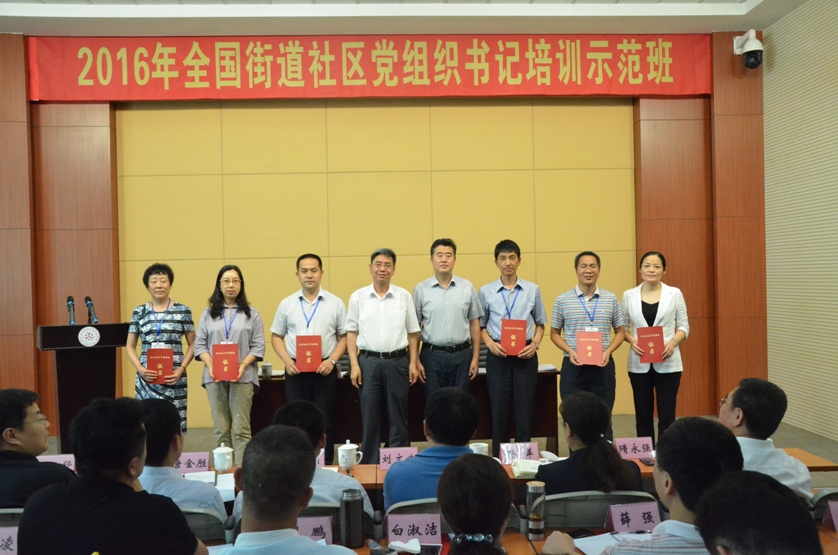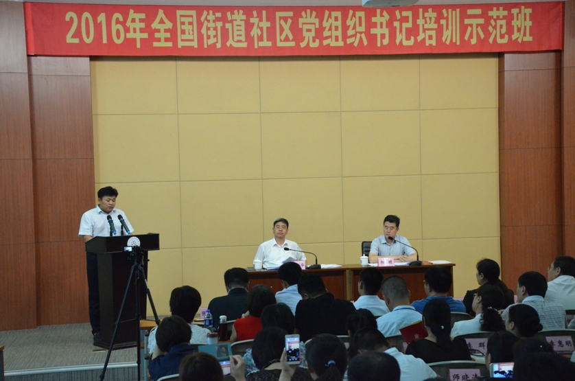 7月8日下午2点,由中组部主办,辽宁省委组织部、辽宁社区干部学院承办的2016年全国首期街道社区党组织书记培训示范班班在东北大学机电学馆201室顺利结业。辽宁省委组织部副部长、辽宁社区干部学院第一副院长赵建华,东北大学党委副书记、辽宁社区干部学院常务副院长杨明及其他有关领导出席了此次活动。会议由杨明同志主持。