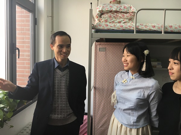 夏院长耐心地对每一个寝室进行参观和走访,对风格积极向上,环境干净整洁的寝室进行夸奖和表扬,并关切地询问同学们的学习和生活状况,督促大家要认真学习,积极实践,并注重观察和解决宿舍内存在的实际问题。同时留心同学们对大学生活的适应状况,耐心地解答同学们提出的问题,使同学们在异地他乡也能感受到来自老师的深切关爱,感受到家的温暖。