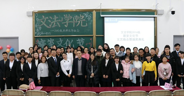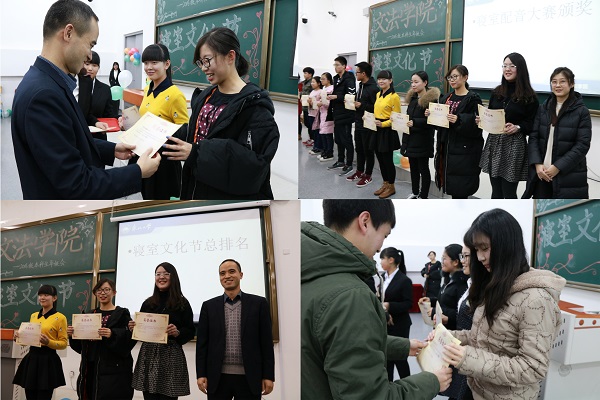 2016年11月22日19:30在建筑学馆A302举办2016级本科生寝室文化节文艺汇演暨颁奖典礼。文法学院党委副书记兼副院长夏风云、文法学院学生工作办公室主任兼2015级本科生辅导员甘霖、文法学院2014级兼2016级本科生辅导员彭舟以及文法学院2016级全体同学参加了颁奖典礼。各位老师作为嘉宾与同学们一起观看了精彩的晚会节目,并为活动中表现突出的寝室颁奖。