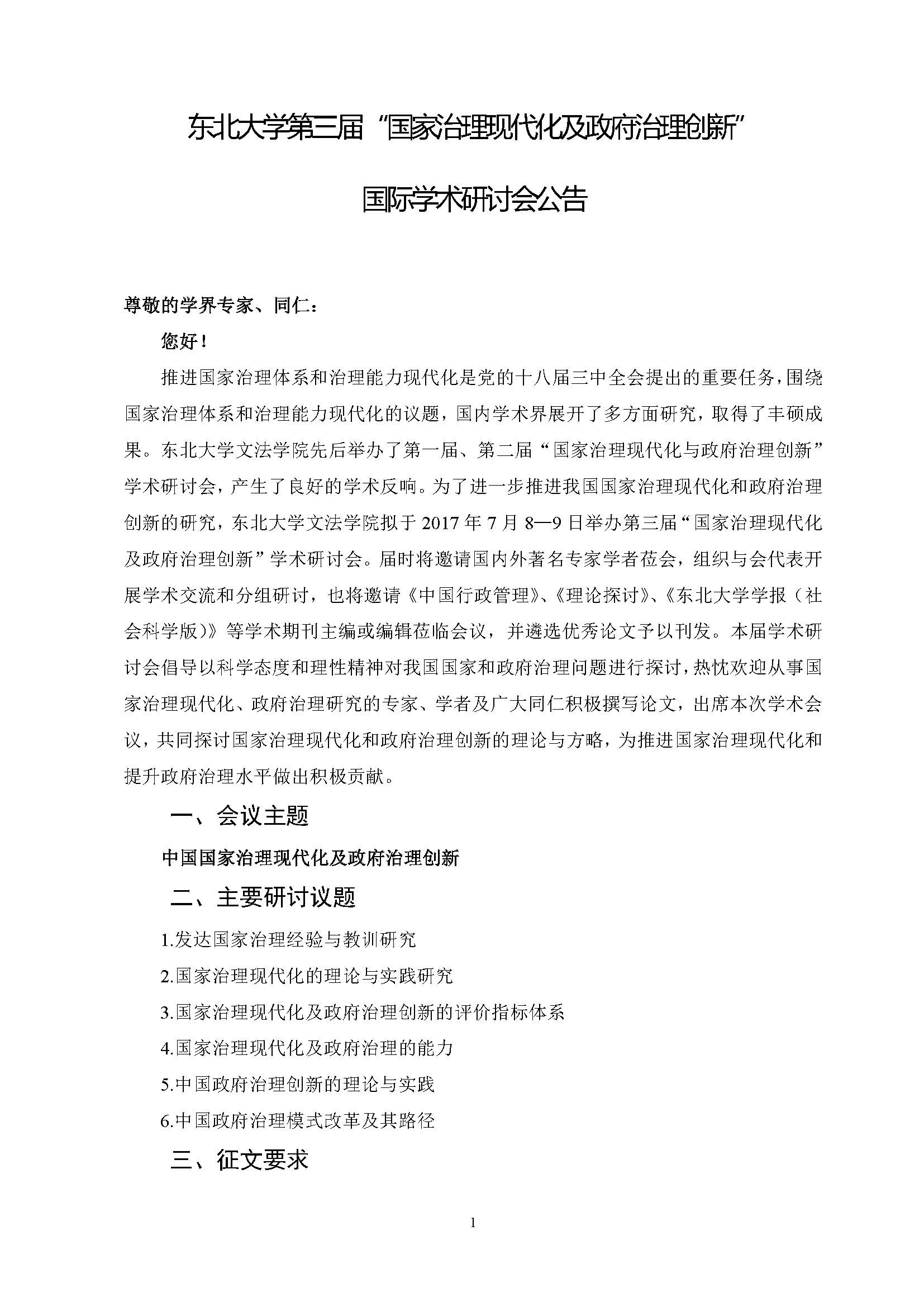 东北大学第三届“国家治理现代化及政府治理创新”国际学术研讨会公告