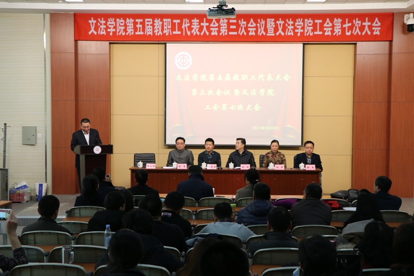 3月10日下午2:30,文法学院于东北大学南湖校区机电馆201举行了第五届教职工代表大会第三次会议暨文法学院工会第七次大会。校党委副书记杨明、校工会副主席孙东来、部分兄弟学院工会主席和文法学院全体教职工参加了会议。会议由隋永强副院长主持。