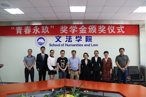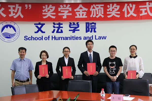 为鼓励在校生继承爱校荣校的优良传统,发扬努力奋斗的优良作风,培育饮水思源的感恩情怀,“青春永玖”奖学金颁奖仪式于2017年6月15日中午13:00在文管学馆A202室举行。马克思主义学院党委书记张满胜、马克思主义学院党委副书记兼副院长李晓璐、文法学院党委副书记兼副院长夏风云、马克思主义学院学生办公室主任汪洋及浙江大学中国哲学专业博士生、东北大学优秀校友王聪出席了本次颁奖仪式,仪式由文法学院2014级兼2016级本科生辅导员彭舟主持。