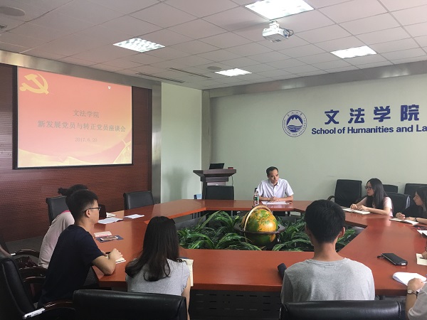 2017年6月20日中午12:50,文法学院在文管B202召开2017年上半年新发展党员与转正党员座谈会,加强发展党员的过程教育与管理,督促党员同志充分发挥先锋模范作用。文法学院党委副书记兼副院长夏风云老师,2014级兼2016级本科生辅导员彭舟老师出席会议。会议由彭舟主持。