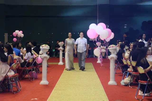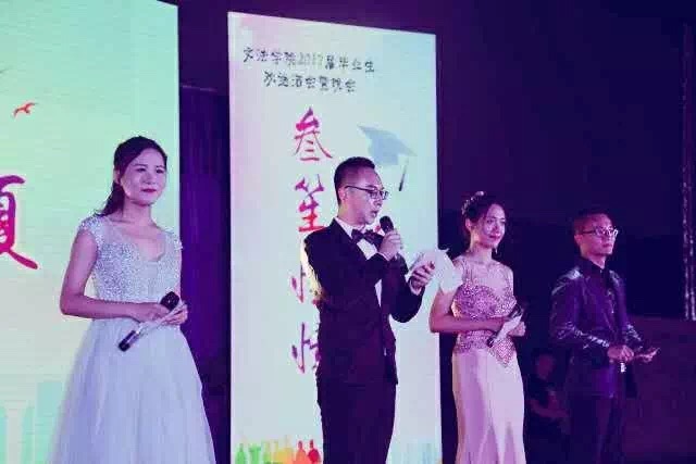 17:30,毕业生们身着精致的礼服在优雅的音乐声中缓缓走上金毯,在毕业签名墙上签下了自己的名字。现场大屏幕展示着他们的身影,优雅稳重,又不失青春飞扬。出席本次活动的嘉宾与老师们亦在毕业生们的陪伴下在同学们的欢呼声中走过金毯隆重登场,并在签名板上写下对毕业生的期待与祝福。金毯仪式过后,一段精彩的开场视频和活泼欢快的开场舞蹈拉开了晚会的序幕,随后张雷书记致辞,他与毕业生共同回忆了四年间最值得纪念和珍藏的点点滴滴,他高度赞扬了2017届毕业生在校的优秀表现,并对毕业生寄予殷切期望和深深祝福。致辞结束后,张雷书记为酒会开启香槟,并同优秀毕业生代表逯馨共同浇注了香槟酒塔,那缓缓流淌的美酒寓意文法学院师生情谊天长地久,寓意文法学院一代代学子积厚流光,源源不断!随后,东北大学对外联络与合作处处长、校友总会办公室主任李鹤,党委宣传部吕静,学生工作处张哲,团委刘海军,创新创业学院王刚一同上台为毕业生切开蛋糕,李鹤代表东北大学校友会寄语毕业生,并叮嘱毕业生要常回母校看看。