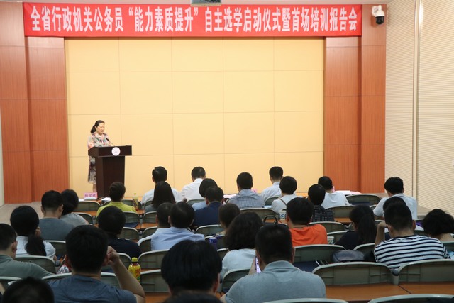 为适应干部个性化、差异化培训需求,进一步增强培训的针对性和实效性,辽宁省人力资源和社会保障厅、辽宁省公务员局在省直机关公务员中开展了“能力素质提升”自主选学活动。8月2日,自主选学启动仪式暨首场培训报告会在东北大学机电馆201教室举行。辽宁省公务员局局长王育仁、副局长杨宝斌,辽宁大学副校长徐平,东北大学文法学院院长孙萍,辽宁省政府各有关单位人事(干部)处负责自主选学培训工作同志、自主选学授课专家学者以及参加首场选学培训的省直机关公务员共约150人参加了启动仪式。启动仪式由杨宝斌副局长主持。