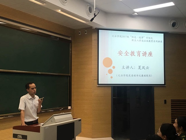 2017年9月7日18:20,文法学院2017级“阳光*逐梦”计划新生目标教育系列活动之安全教育讲座在浑南校区1号教学楼A307室顺利开展,文法学院党委副书记兼副院长夏风云受邀担任本场讲座的嘉宾。文法学院2017级全体新生出席,分团委书记兼新生辅导员蔡晓淇主持。