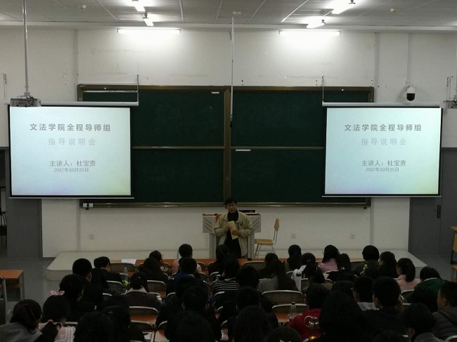 10月25日16:00,文法学院2017级全程导师制指导说明会在建筑楼 B302室举行,文法学院副院长杜宝贵老师担任主讲人为17级全体新生讲解了学院的导师制内容和选择建议。
