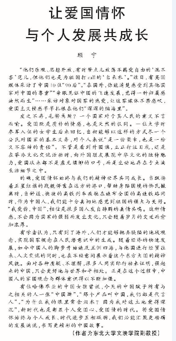 有位哈佛毕业的中国女孩曾说,今天的中国赋予所有与之相关的人一张“中国牌”,“那个产品叫中国,我们都是代言人”。“为什么我的眼里常含泪水?因为我对这土地爱得深沉”,新时代也是彰显个人爱国心、爱国情的时代。将爱国情怀始终与个人成长、时代进步互相砥砺,我们必能汇聚更磅礴的发展洪流,书写更精彩的中国故事。