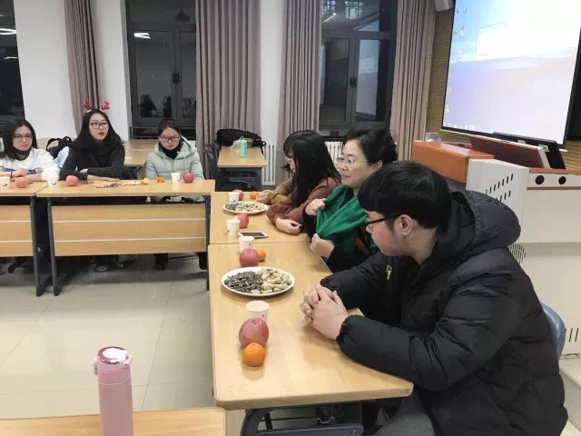 会上,牟老师首先进行了热诚恳切的讲话。她祝大家圣诞快乐,并对同学们的学习与生活表达了温馨的关怀。牟老师课节很多,但是她仍然利用了午餐后与7-8节之间的空隙时间驱车到四公里外的白塔自费为同学们买了最好的水果和干果等,与同学们共同联欢。这一切,让我们真切地感受到 “牟妈妈”的关心,感觉自己像在父母身边一样被呵护。