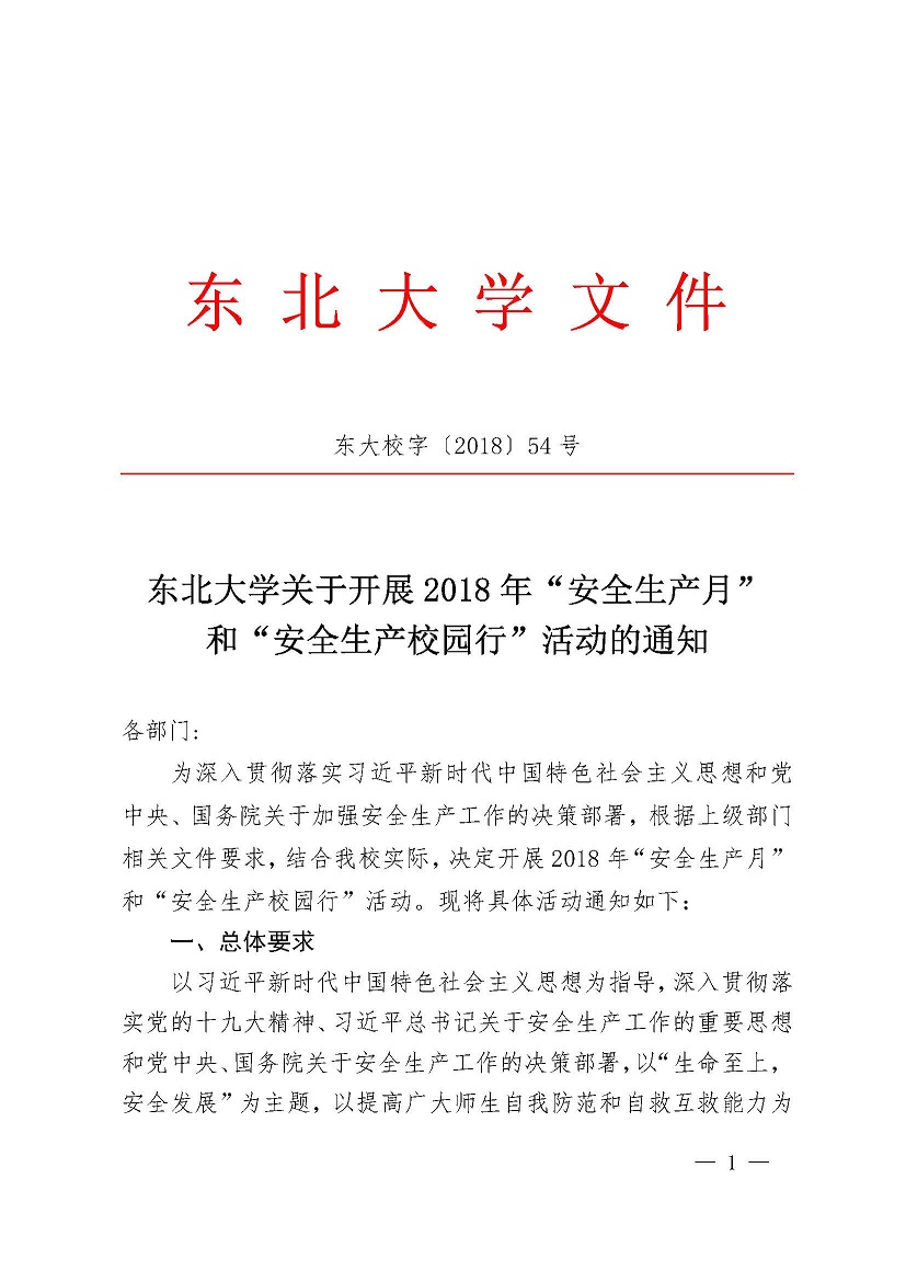 东大校字【2018】54号 东北大学关于开展2018年“安全生产月”和“安全生产校园行”活动的通知