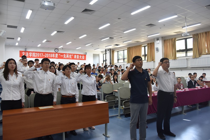 大会在国歌声中拉开帷幕。副院长杜宝贵宣读了《关于表彰文法学院2017-2018年度先进党支部、优秀党务工作者、优秀共产党员的决定》。行政管理系党支部等5个支部获得文法学院“先进党支部”称号,陈德权等3名同志获得文法学院“优秀党务工作者”称号,卞地诗等18名同志获得文法学院“优秀共产党员”称号。教师代表土地管理研究所党支部刘馨蕊、学生代表2017级硕士研究生高天芮先后发言,他们结合自身工作、学习,从不同角度介绍了自己过去一年的经验、体会和感悟。张雷作为领誓人带领全体预备党员面向党旗庄严宣誓,副院长杜宝贵监誓。