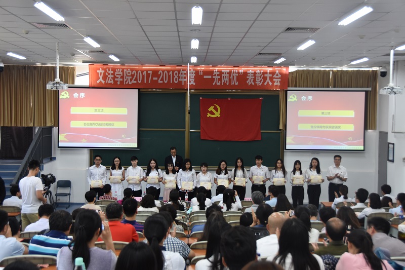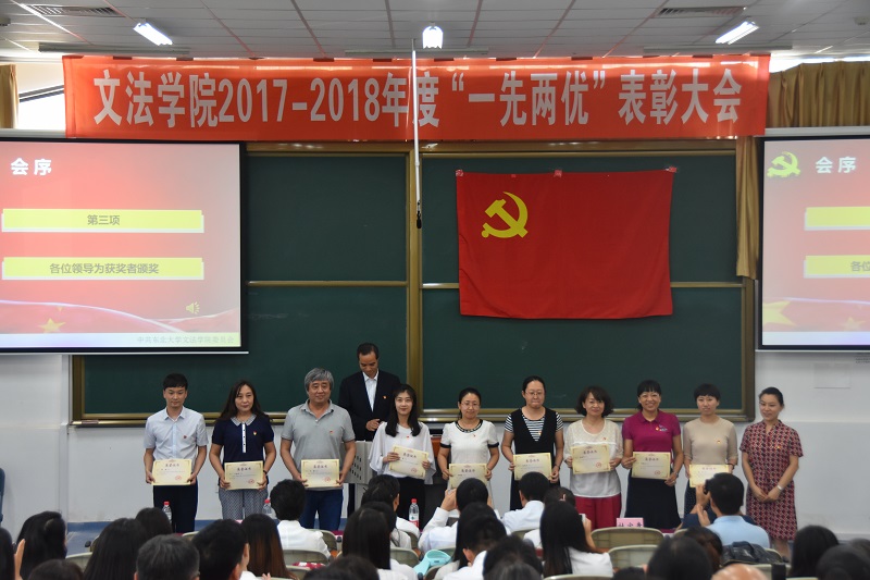 6月26日中午14:30,文法学院2017—2018年度“一先两优”表彰大会在浑南校区信息学馆A109室召开。校党委常委、组织部部长王辉,校党委宣传部副部长吕静,学院党委书记张雷,党委委员、副院长杜宝贵,党委副书记兼副院长夏风云以及学院全体师生党员与部分积极分子出席会议,会议由夏风云主持。