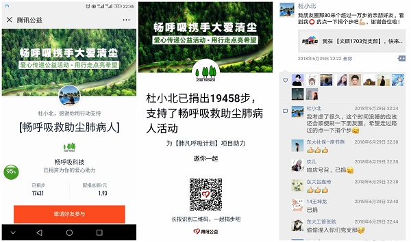 2018年6月至今,文硕1703党支部参与腾讯公益“畅呼吸携手大爱清尘”公益项目,秉承“爱心传递公益活动,用行走点亮希望”的公益理想,关爱尘肺病患者,助力公益救援。