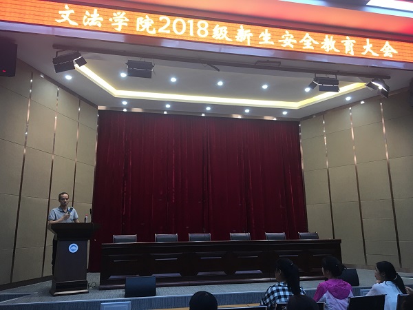 为进一步提升学生安全意识,增强学生安全防范自主性。文法学院于9月18日下午16:00,在文管学馆B230会议室举办2018级新生安全教育大会,会议由文法学院党委副书记、副院长夏风云主讲,文法学院2018级辅导员姜冬主持。