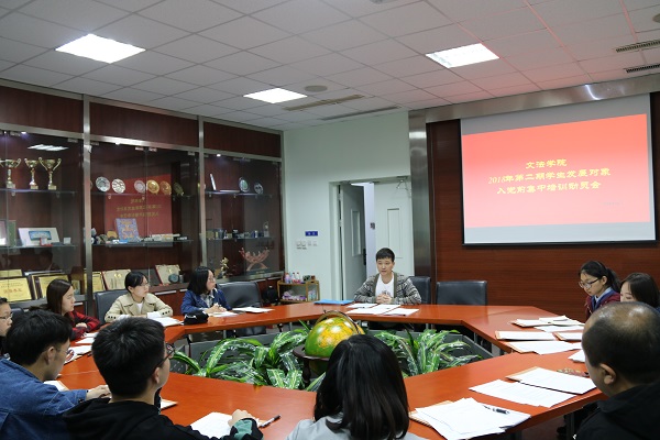 为确保我院学生发展对象能够保质保量的完成学校安排的培训任务,我院于10月8日晚6点半在文管楼A202开展了2018年第二学期学生发展对象入党前集中培训动员会,来自文法学院的各党支部书记以及18名党员发展对象参加了动员会。会议由文法学院党委组织员彭舟主持。