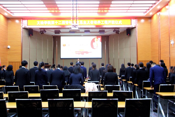 仪式以文法学院“青马工程”视频简介拉开序幕,视频从“青马”的起源、意义、内容及对上一期青马培训的内容回顾等方面向同学们展示了青马培训的相关内容。随后全体成员合唱《共青团团歌》。