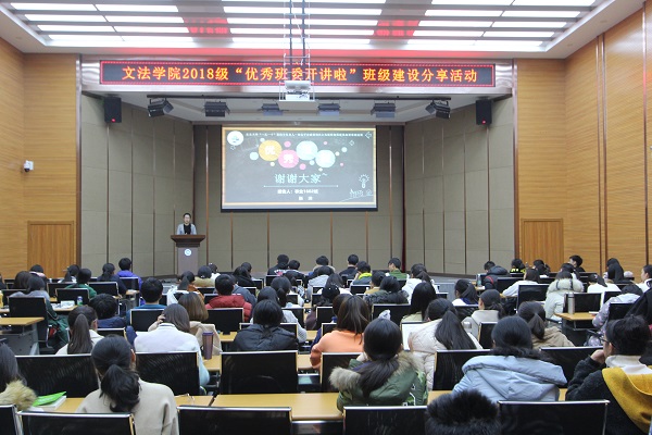 为贯彻落实东北大学“一五一十”思政文化育人一体化平台建设项目要求,弘扬班级优秀文化,加强学习风气建设,文法学院2018级本科生“优秀班委——开讲啦”班级建设经验分享活动于2018年11月19日16:00在文管学馆B230会议室召开。活动邀请了获得“东北大学2016-2017学年先进班集体标兵”称号的事业1502班班长李泽昊、获得“东北大学2016-2017学年先进班集体”称号的事业1602班班长张洋到场与文法学院全体2018级本科生进行交流,辅导员姜冬参加了本次活动。