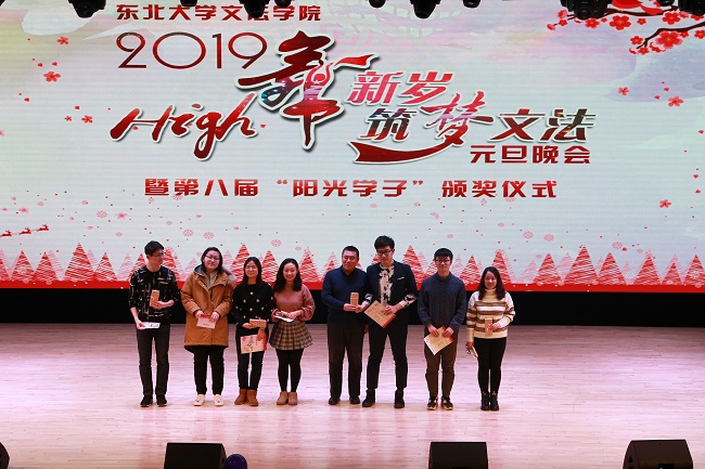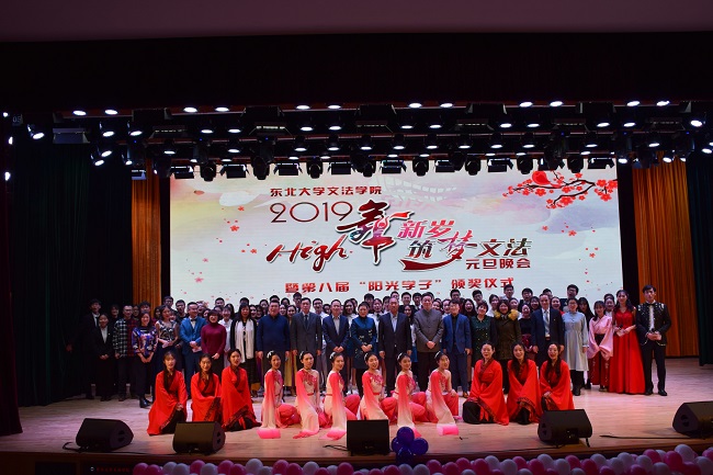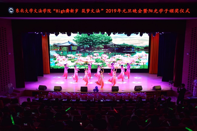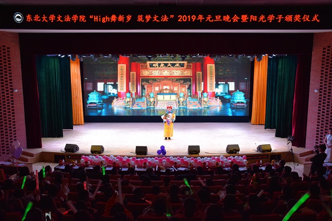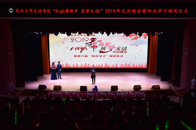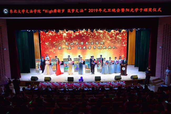 新曲辞旧岁,high猪庆华年,歌扬舞耀日,天涯共此时。在过去的2018年里,文法学院不忘初心,砥砺前行,用最好的成绩展现风采,用最大的梦想拼接未来。文法学子团结一心,勇往直前,全力以赴,展望未来12月24日18:30,东北大学文法学院“High舞新岁,筑梦文法”2019年元旦晚会暨第八届“阳光学子”颁奖仪式于浑南校区图书馆报告厅举行。辽宁省律师协会会长、辽宁同方律师事务所主任杨兴权,辽宁同方律师事务所高级合伙人张鑫辉,辽宁同方律师事务所高级合伙人韩莹,辽宁同方律师事务所高级合伙人王占平,辽宁同方律师事务所高级合伙人刘钦群,东北大学党委宣传部副部长史鉴,浑南校区管委会副主任张哲,学生工作处副处长王纯武,团委副书记张忠英,创新创业学院副院长王刚,新疆内派教师阿米娜、腾红;文法学院院长孙萍,文法学院党委书记、跨文化战略研究院院长张雷,文法学院副院长隋永强,文法学院党委副书记兼副院长夏风云,跨文化战略研究院办公室主任王一,文法学院办公室主任李丹,教学科研办主任陈玉芬等机关办公室老师以及各班班导师和专业教师代表出席了本次活动。