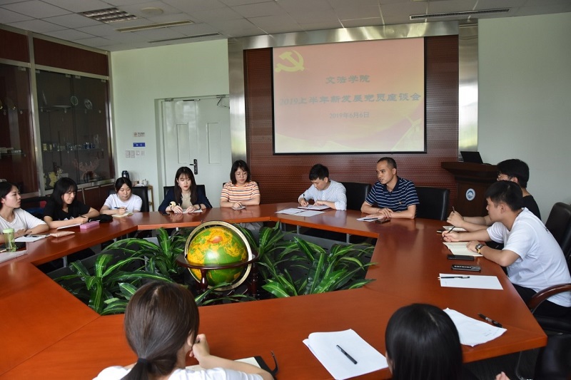 2019年6月6日中午13:00,文法学院在文管A202召开2019上半年新发展党员座谈会,以加强发展党员的过程教育与管理,督促党员同志充分发挥先锋模范作用。文法学院党委副书记兼副院长夏风云老师,文法学院党委组织员兼2016级本科生辅导员彭舟老师出席会议,全体2019年上半年新发展党员参加此次座谈会。会议由彭舟老师主持。