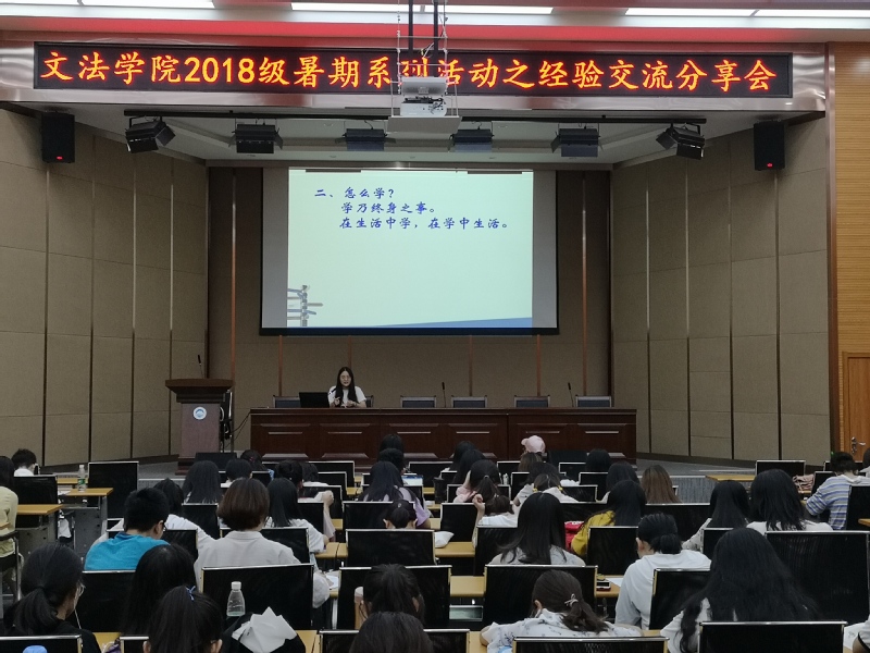 为进一步丰富学生业余生活,增强大一学生对大学生活的体验与认知,文法学院2018级暑期系列活动之经验交流分享会于2019年7月16、18日18:30在文管楼B230开展。本次交流会邀请了在科研创新、专业学习、学生工作等方面有突出表现的文法学院2018级行政管理专业硕士生孙宁和2016级公共事业管理专业本科生李函珂。2018级本科生辅导员兼研究生辅导员姜冬和全体2018级本科生到场参加交流会。