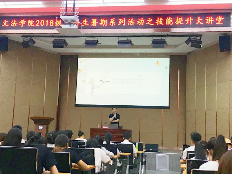 为进一步丰富学生业余生活,提升大一学生的综合能力,文法学院2018级暑期系列活动之技能提升大讲堂活动于2019年7月23日18:30在文管楼B230开展。本次活动邀请到了沈阳广播电视台总编室副主任,资深节目主持人,高级编辑,国家级普通话水平测试员龚波为文法学院2018级本科生进行普通话训练指导。2018级本科生辅导员姜冬和全体2018级本科生到场参加。
