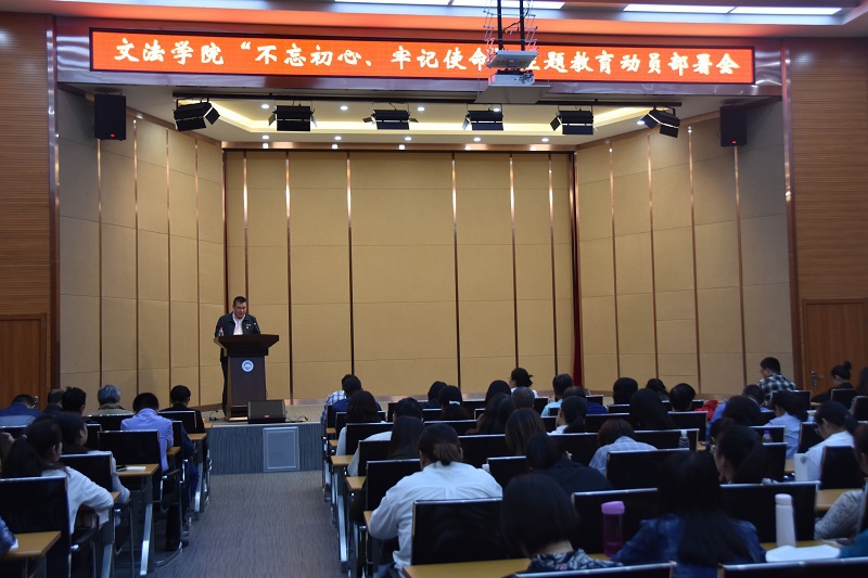 隋永强就文法学院开展“不忘初心、牢记使命主题教育作动员讲话。他向全体党员传达了东北大学“不忘初心、牢记使命”主题教育动员大会精神,宣读了《东北大学党委关于开展“不忘初心、牢记使命”主题教育的实施方案》主要内容和相关要求,解读了《文法学院“不忘初心、牢记使命”主题教育实施方案》,部署了学院党委下一阶段重点工作和具体安排,为主题教育开展设定了时间表和路线图。