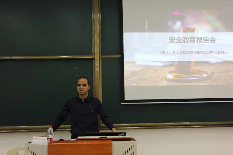 2019年10月9日13:30,文法学院2019级新生安全教育主题报告会在东北大学浑南校区建筑学馆A102举行。文法学院党委副书记兼副院长夏风云,学生工作办公室主任、2019级本科生辅导员甘霖以及2019级全体本科新生参加此次报告会。