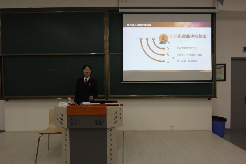 王媛媛法官结合“河南小郑”跳楼案、“江西小谭非法拘禁案”等多个真实案例,详细讲述了非正规“校园贷”公司经营特点以及校园贷中的种种“套路”,让学生能够更加直观的了解校园贷的实质。同时,她从多年法律工作经验出发,为学生如何提高自我防护意识给出建议,并从普法宣传角度提醒在校学生学会主动求助,勇于用法律武器保护自己。