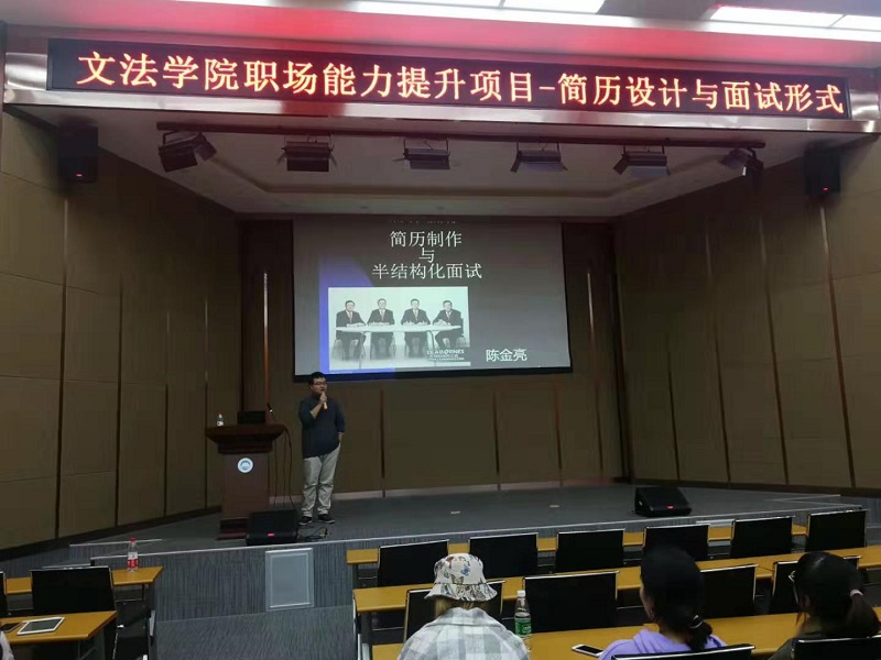 2019年10月23日13:30,文法学院于文管学馆B230举办职场能力提升讲座。文法学院优秀校友陈金亮受邀主讲简历设计与面试形式,百余名意向就业的同学参与其中。