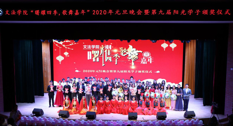 12月19日19:00,东北大学文法学院“曙耀四季,歌舞嘉年”2020年元旦晚会暨第九届阳光学子颁奖仪式于浑南校区图书馆报告厅举行。东北大学学生工作处副处长徐长文,东北大学团委副书记孙涛,东北大学学生指导服务中心副主任程宏,东北大学创新创业学院副院长王刚,东北大学新疆班班主任阿米娜、付新红、林宏磊,文法学院院长张雷,党委书记隋永强,党委副书记兼纪委书记孙宏伟,副院长李丹,党委副书记兼副院长夏风云,MPA办公室主任王亮,学生工作办公室主任甘霖,党委组织员彭舟,学院办公室庄会虎等出席了本次活动。