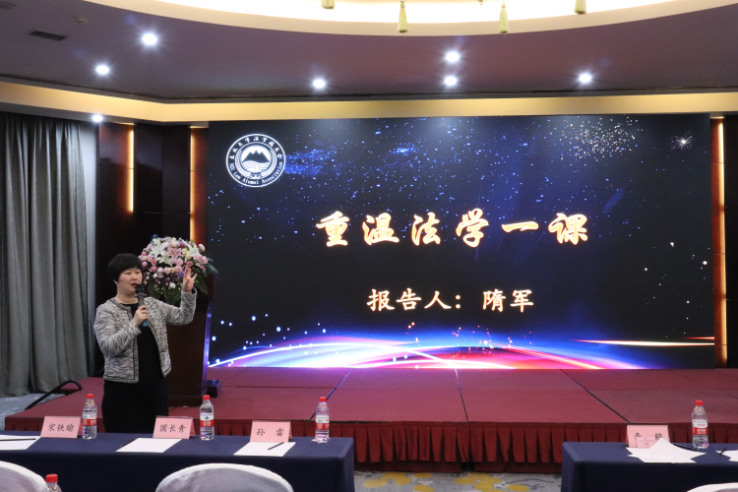 授牌结束后,法学系主任隋军老师为校友们带来《重温法学一课》的主题报告,介绍了法学系教师在课堂教学上的创新,以《外国民商案例选读》这门课为例,展现了线上线下混修这一创新教学模式的特点及其良好的教学效果。