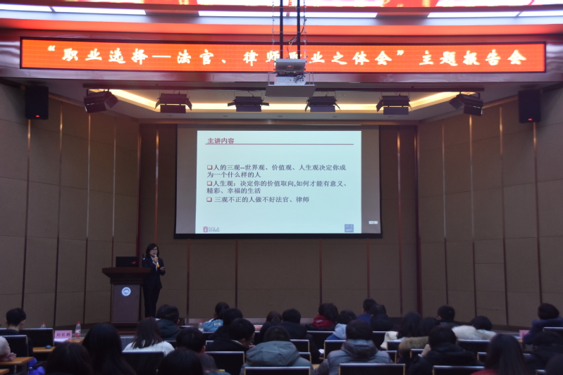 刘律师从自身实际职业经历出发,首先为同学们概数了法学专业学生可能的职业选择与未来规划,同时结合自身的经历阐述了法官与律师的职业特点,分别详细解读了法官与律师两个职业应具有的职业素养、优势与挑战以及二者相互间的关系,她表示,政治素养、专业能力和道德素质是一名好法官和好律师的共同标准,而公正、专业与互相尊重也是二者共同的职业期待。她强调,随着国家司法改革进程的加快,法律从业者的就业环境与社会地位都将逐步得到提升,而作为一名青年法律者,应主动承担责任与使命,为推进依法治国,维护法律的公平、正义,维护社会的和谐稳定不懈努力奋斗。