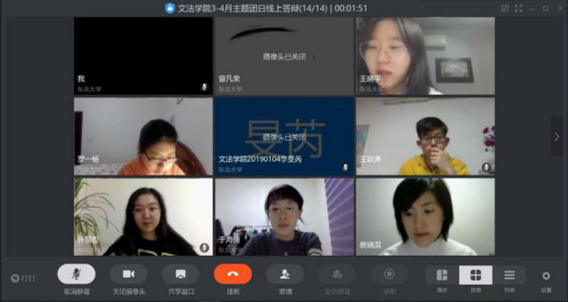 2020年4月8日20点,文法学院3-4月校优团日答辩活动以钉钉线上会议的形式开展,各院优团支部全员参加,文法学院团委书记蔡晓淇、院团委副书记王馨笛和院团委思想教育中心工作人员作为评委参加本次答辩活动。团支书们从团日综述、团日开展过程和学习效果、团支书总结等方面进行了3到5分钟的展示与陈述。蔡晓淇老师和王馨笛同学针对每位团支书的答辩情况进行了简单的提问针对每一个问题,团支书们都细致地进行了回答。
