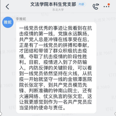 活动中,支部党员积极分享个人学习心得与体会。安惜桐同志结合大学生党员身份分享对张静静同志英雄事迹的感悟,表示要不忘初心,发挥党员先锋模范作用;尹孟晗、殷铱彬、宋军彦等同志谈到了我国在当前仍然严峻的形势下的抗疫新进展,基层党组织在抗疫中发挥的重要作用,并对接下来的防疫工作提出建议。随后,党支部其他同志也纷纷以文字形式在钉钉群里分享自己的学习心得。