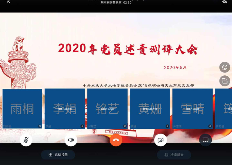 2020519日下午1400,文硕1803党支部依托钉钉平台开展2020年党员述责测评活动。文硕1803党支部全体党员以及文硕1803班全体同学出席本次会议。会议由党支部书记刘雨桐主持。首先,由刘雨桐同志解释会议要求,宣布会议开始,并代表党支部做一年以来的工作总结,然后全体党员依次进行述责报告。