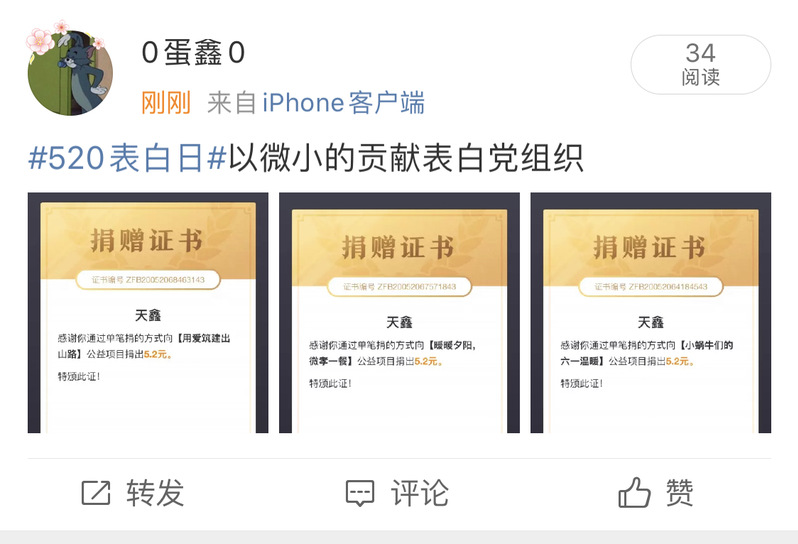 曹天鑫同志以捐款的方式为党组织贡献力量