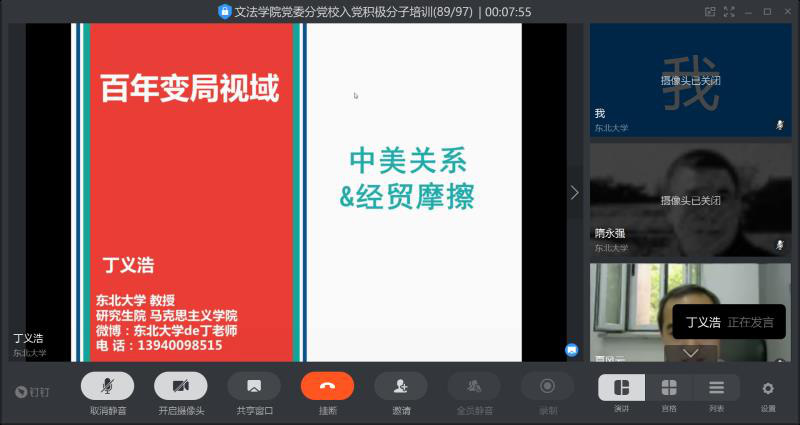 2020年6月10日14:00,文法学院党委党校邀请研究生院副院长兼党委研究生工作部部长丁义浩教授做“百年变局视域下的中美关系和经贸摩擦”主题报告。文法学院党委书记隋永强,党委副书记、副院长夏风云以及2020年入党积极分子培训班学员参与本次学习,报告会由夏风云主持。