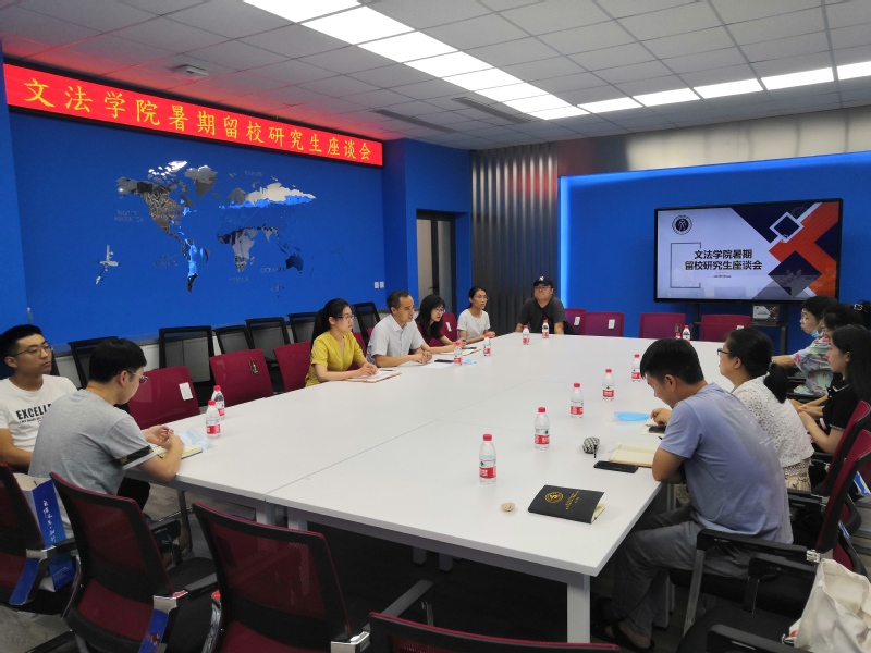 7月25日,为进一步了解暑期留校研究生实际需求,文法学院举办暑期留校研究生座谈会,学院党委副书记兼副院长夏风云、学生工作办公室主任甘霖、研究生辅导员姜冬及全体暑期留校研究生参与了座谈。