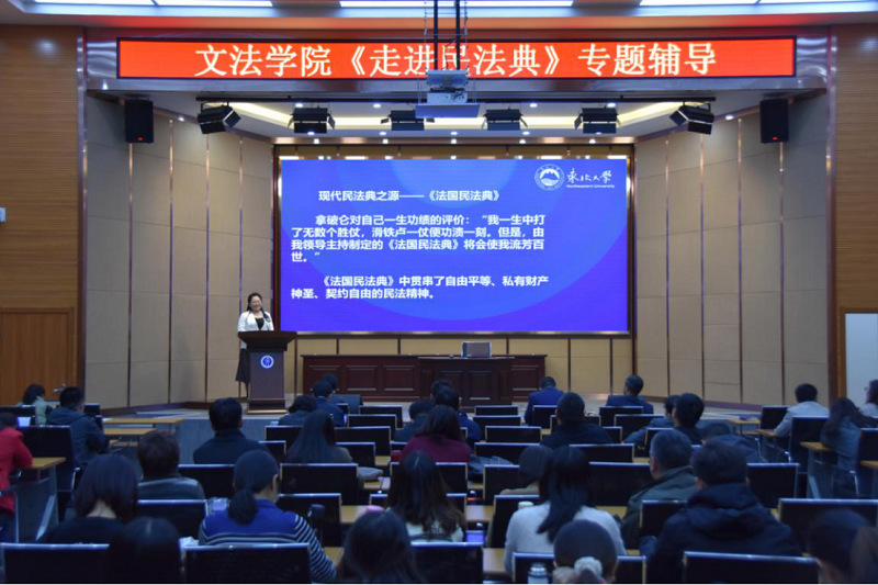 为深刻认识民法典颁布实施的重大意义,更好地培养文法学院师生学法、守法、懂法、尊法、用法意识,10月14日下午2:00,文法学院党委邀请法学系牟瑞瑾副教授作《走进民法典》专题辅导。文法学院党委书记隋永强主持,全体教师及党员代表共计120余人参加。
