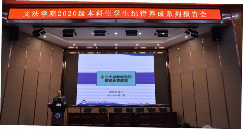2020年10月23日,东北大学文法学院2020级本科生学生纪律养成系列报告会在文管学馆萃升报告厅举行,东北大学教务处副处长徐林受邀为同学们作题为“东北大学教学运行管理政策解读”的主题报告。文法学院党委副书记兼副院长夏风云,学院教学办、学生办老师以及2020级本科生参与本次会议。