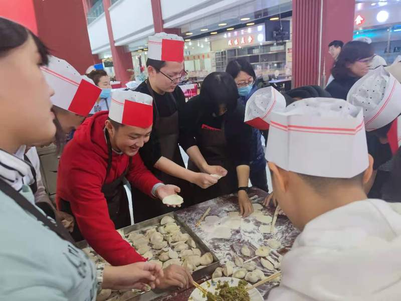 赛前,刘主任向同学们详细介绍本次比赛的内容及规则,并完成分组、发放围裙和厨师帽等准备工作,确保比赛有序进行,保证比赛场地的干净整洁。比赛开始后,各个小组的同学们分工明确,在厨师的指导下,亲自完成饺子的制作。赛后,评审小组进行评价,最后工作人员与同学们共同品尝劳动成果,并合影留念。