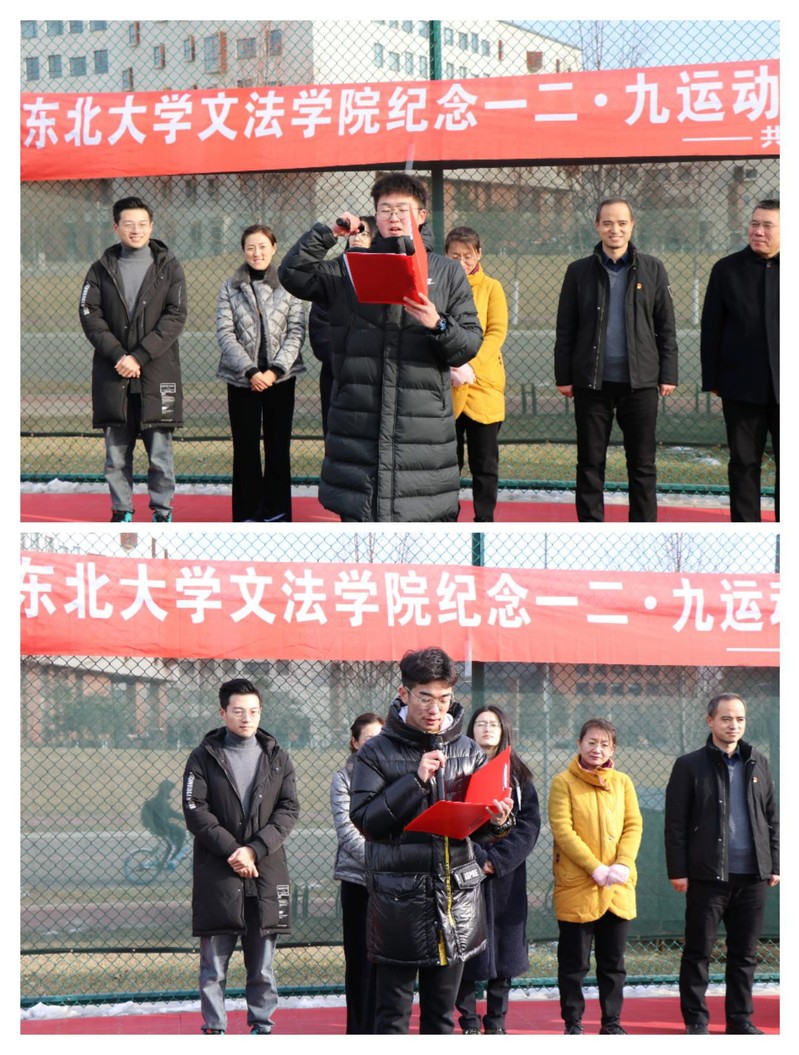 为纪念“一二·九”抗日救亡运动,营造爱国爱校的优良学习氛围,1221300,文法学院纪念一二·九运动85周年活动之师生趣味运动会在浑南校区室外篮球场顺利举行。文法学院党委书记隋永强,党委副书记兼副院长夏风云,新闻学系顾宁,法学系赵进华,公共事业管理系赵晶,土地管理研究所刘馨蕊、刘蜀涵,文法学院团委书记兼2017级本科生辅导员蔡晓淇,2020级本科生辅导员周志平出席了本次活动。