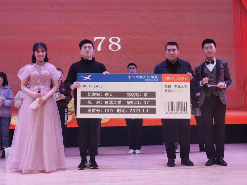 精彩节目贯穿晚会全程,展现师生风采。院长张雷带来朗诵《老了》,大气磅礴,震撼人心,赢得全场掌声雷动;法学系法学1701班班导师牟瑞瑾深情演唱《牵手》,用歌声讲述了与东大相伴十八载的故事,三尺讲台笔霜染白青春鬓,一片丹心热血铸就栋梁才,字字肺腑,真情流露,引起了全场观众的共鸣。文法学子也为新春献上热情与期盼,古典舞、街舞、民族舞、歌伴舞引人入境,合唱、小品、朗诵发人深省。辞旧迎新,曙耀四季,在岁岁更迭之际,文法师生向2021发起盛情邀请,迎接来年全新的挑战。在节目之间,学院通过抽奖送出返乡机票、火车票、米家系列电子产品、海马体照相馆体验券等新年礼物,为文法学子送上来自学院的温暖与祝福。