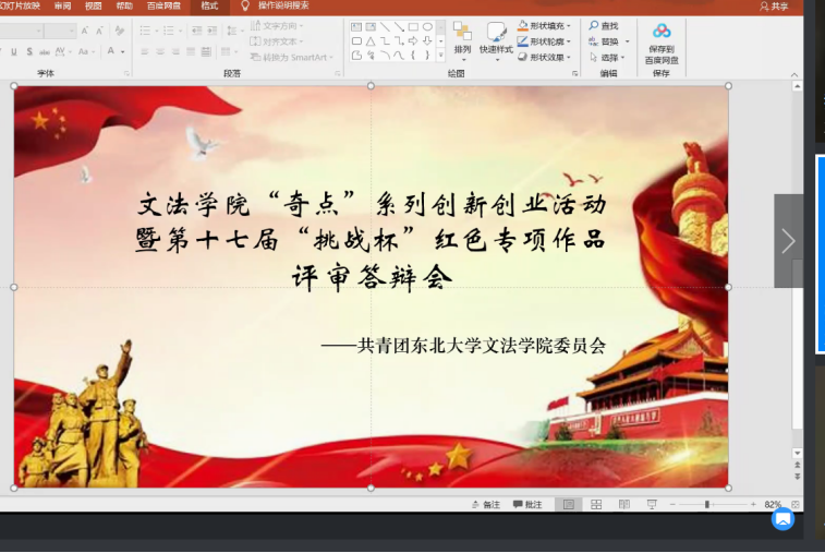 2021年3月4日18:00,文法学院“奇点”系列创新创业活动暨第十七届“挑战杯”红色专项作品的评审答辩会通过钉钉平台顺利举行。文法学院行政管理系李丹老师,文法学院行政管理系曹志立老师及兼职辅导员组成的学生评委们作为本次答辩会的评委参与了本次答辩会。文法学院党委副书记兼副院长夏风云老师,文法学院团委书记蔡晓淇老师也出席了本次会议。