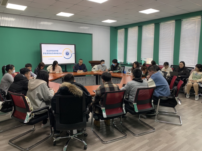 2021年3月8日13:00,文法学院学生工作办公室于文管学馆A211召开新学期学生思想动态调研座谈会,学院党委副书记兼副院长夏风云、学生工作办公室全体成员、兼职辅导员及各年级本科生和研究生共10名学生代表参与此次会议。