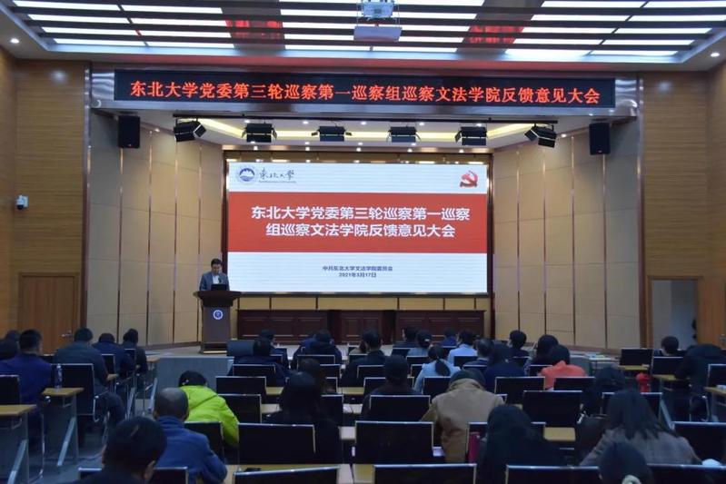 3月17日下午,东北大学党委第三轮巡察第一巡察组巡察文法学院反馈意见大会在文管学馆B230室召开,校党委巡察工作领导小组成员、纪委副书记、党委巡察工作办公室主任王剑,东北大学党委第三轮巡察第一巡察组组长、审计处处长刘海龙及第一巡察组全体成员,党委巡察工作办公室全体人员出席会议。文法学院领导班子成员、全体教师以及学生代表90余人参加会议,会议由文法学院院长张雷主持。
