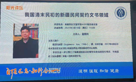 2021年3月19日下午14:00,文管学馆A202(银冈书院),日本学者、兰州大学历史文化学院、教育部西北少数民族研究中心菅原纯教授,应东北大学国家治理研究院的邀请,为我院广大师生作了题为《我国清末民初的新疆民间契约文书领域》的主题报告。本次讲座采取线下方式进行,众多师生现场聆听报告,同时开通了线上直播。讲座由东北大学文法学院陈德权老师主持。